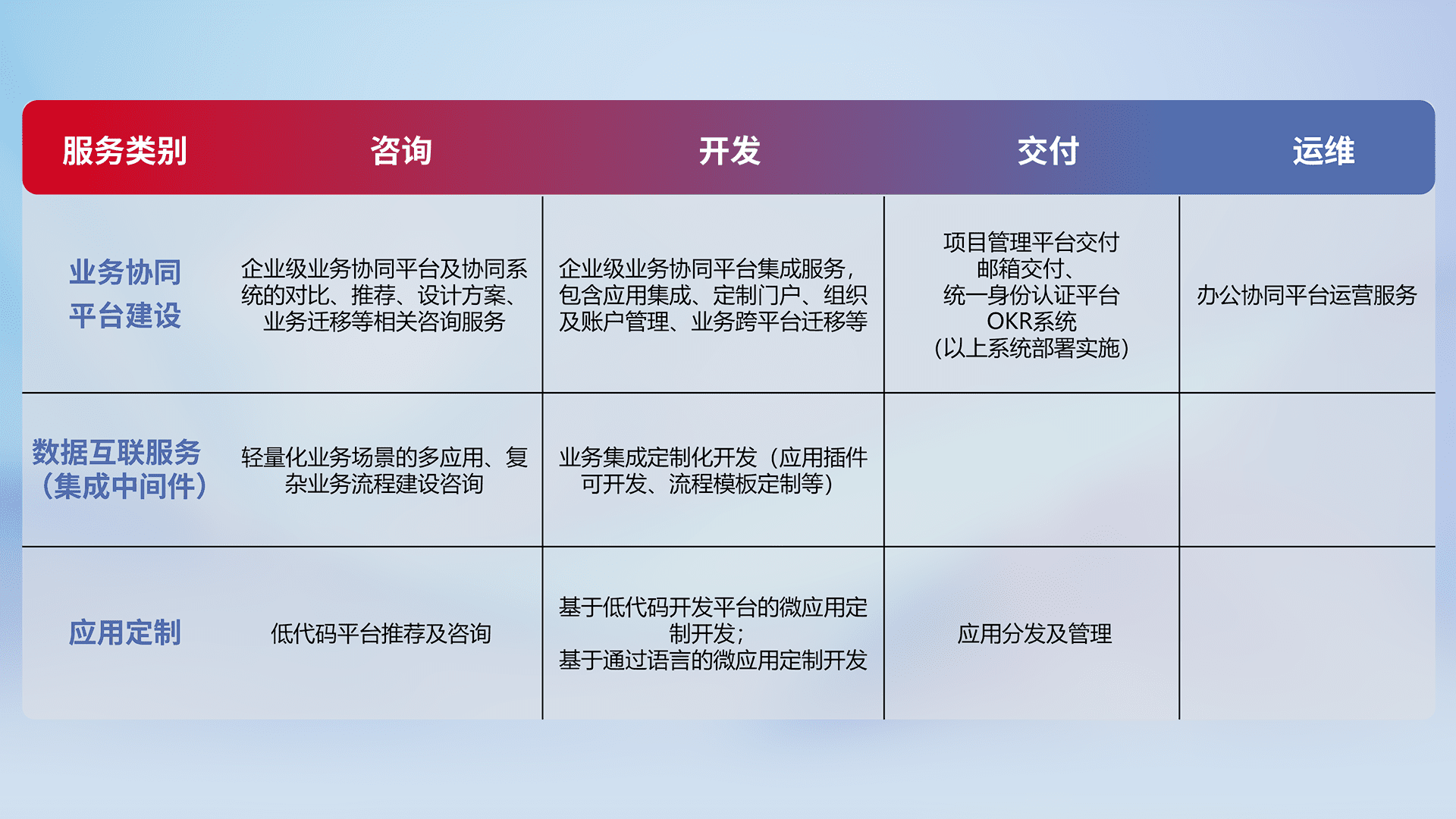 针对钉钉、、、企微、、、IDaas等平台级产品提供产品的规划、、、、方案、、、、交付、、定制化开发等服务,,,实现如统一协同办公、、智能客户服务、、、混合会议管理、、智能数据查询、、、、等业务场景,,实现数字化转型。。。。